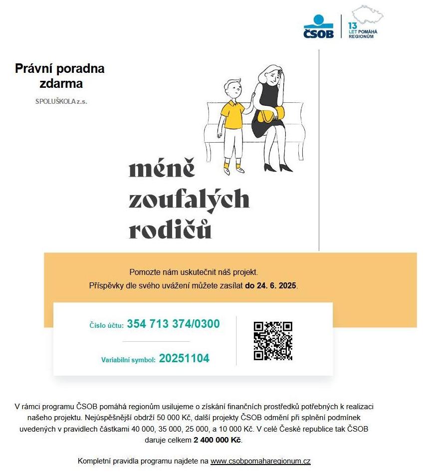 Naše bezplatná právní poradna ročně zodpoví téměř 400 dotazů rodičů, škol i poradenských zařízení týkající se vzdělávacích práv dětí, které potřebují individuální přístup ve vzdělávání. Dětem, jako je Ládík, pomáháme najít cestu, jak ve škole uspět – odborně, systematicky, s respektem k tomu, kým jsou. Právě teď nás můžete podpořit v projektu ČSOB pomáhá regionům. Přispět lze jednoduše online, převodem nebo přes QR kód. Každá částka pomáhá! Přispět můžete tady, kde se také dozvíte více informací o naší poradně, včetně videa, které vystihuje, o čem naše práce vlastně je. Díky vám budeme moci pokračovat v poradenství a pomáhat dalším dětem zažít školu jako bezpečné místo. Děkujeme, že jste s námi!