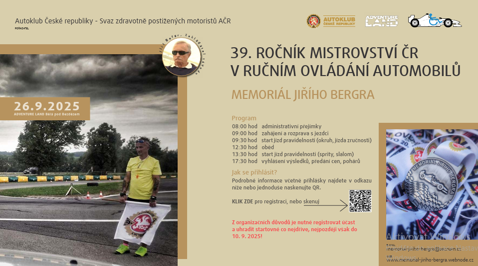 Vážení závodníci, drazí přátelé, přesně za dva měsíce, v pátek 26. září 2025 vás zveme na 39. ročník závodů v ručním ovládání automobilů - Memoriál Jiřího Bergra, který se bude konat poprvé (po odchodu Jirky do nebe) v Adventure Landu v Bělé pod Bezdězem.